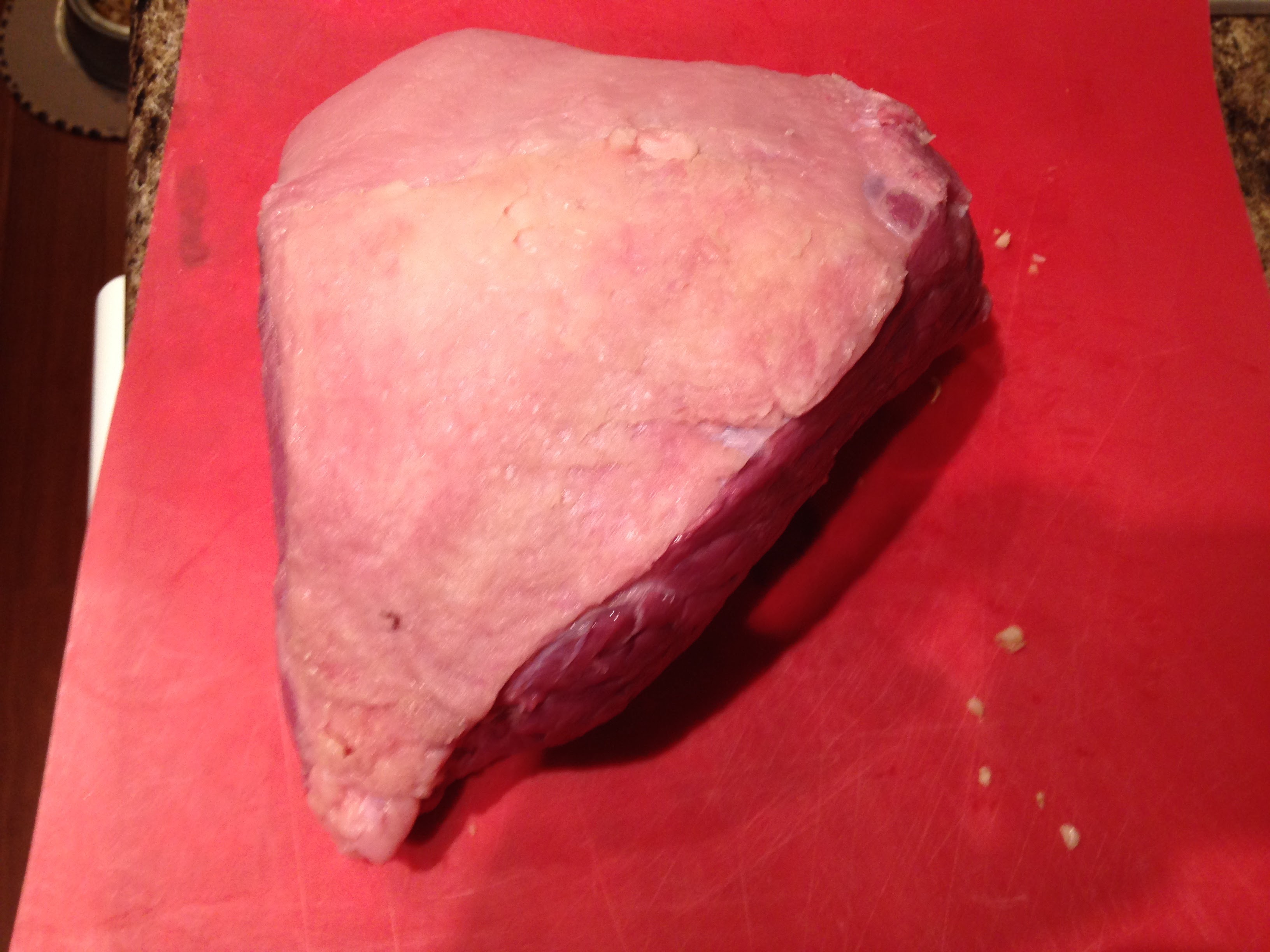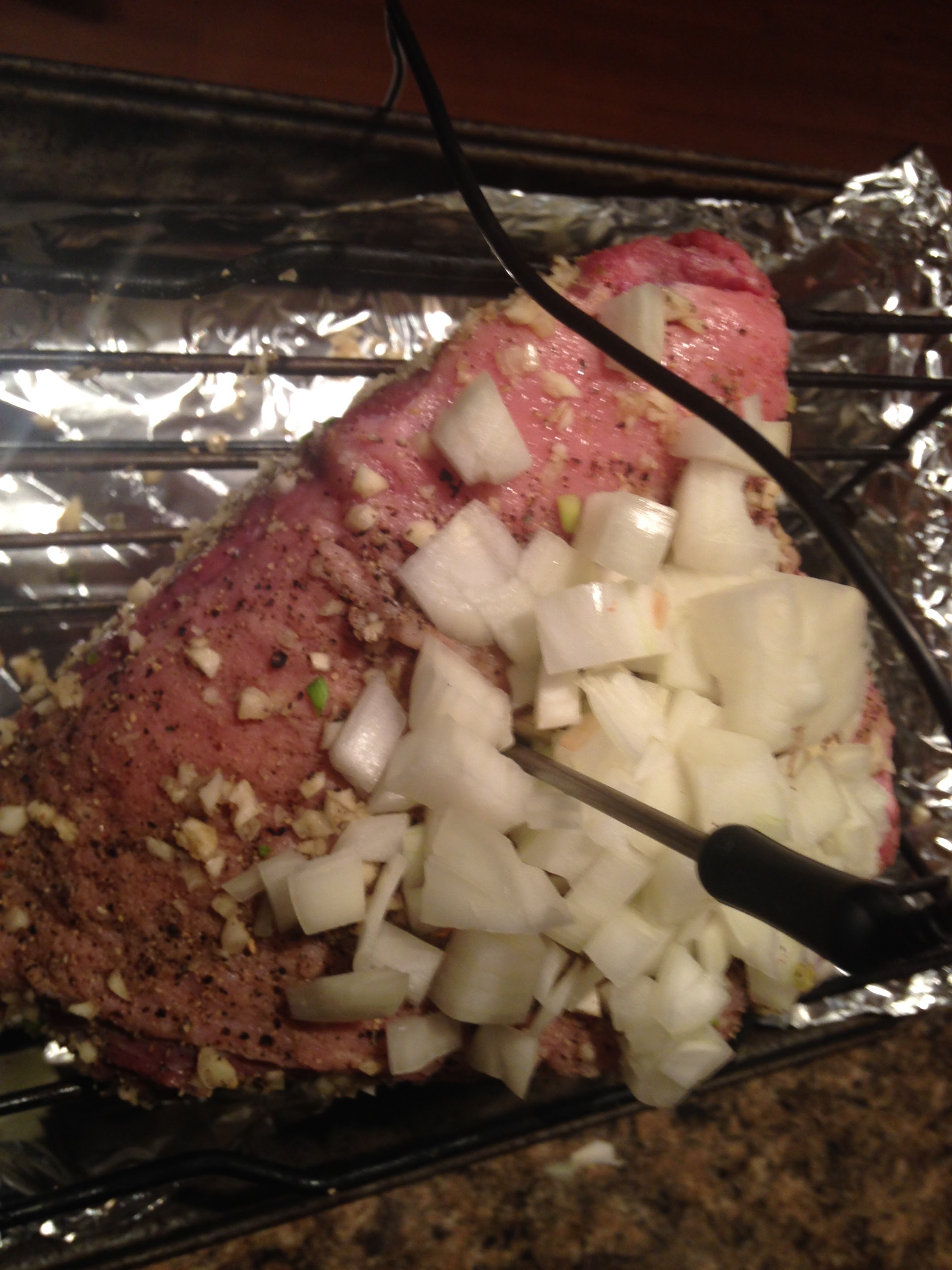 Once that’s finished, take your finely minced garlic and do the same thing. Break out your meat thermometer and stick it in the thickest part of the meat. If your roast has a layer of fat (bottom rounds typically do) arrange that side to be facing up. Doing so will let the fat run down the meat as it cooks, keeping it nice and moist. Arrange in center of rack.