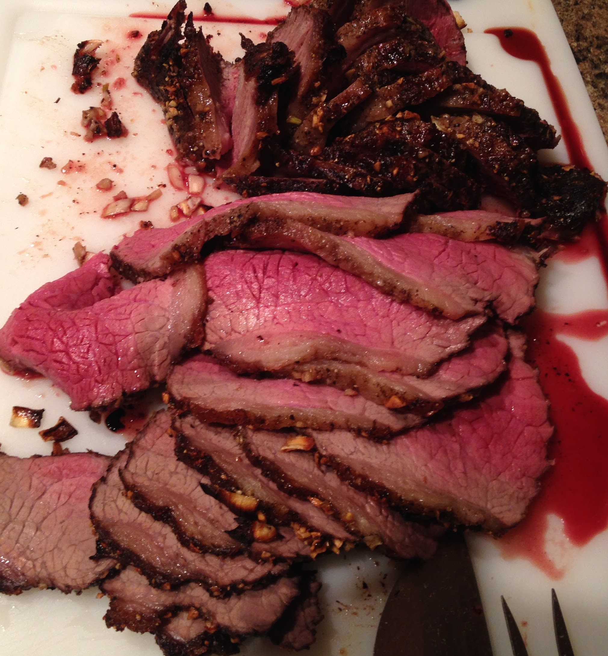 I like my meat rare to medium rare so I’ll set my thermometer to go off at 125 degrees. If you don’t have a thermometer, I typically find that 30 mins per lb will do the trick for a rare doneness.